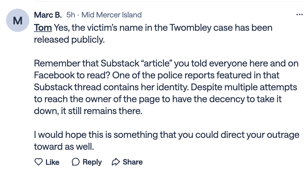 Marc Birtel, a Mercer Island resident and former Starbucks executive who has publicly supported Mercer Island High School PTA President Julie Hsieh, recently stated that this Substack had published a victim’s name and that “multiple attempts” were made to take it down. Anyone can verify that no victim’s name was ever published and no one commented, in any post, that victim identity needed to be removed by simply reviewing the posts.