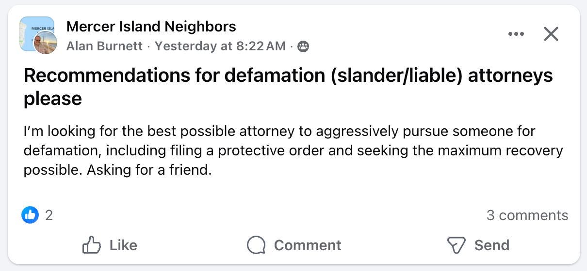 Meanwhile, on Facebook, attorney Alan Burnett (ex-husband of school board candidate Stephanie Burnett) publicly asked for referrals to a libel lawyer. For an attorney to seek legal counsel through a public community forum is highly unusual, and many parents interpreted it less as routine legal housekeeping and more as a signal to those questioning school leadership.